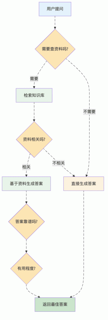 传统RAG就像个死脑筋:无论什么问题,先检索再说。Self-RAG会判断:”嗯,这个问题我直接答就行,不用翻书了。”
