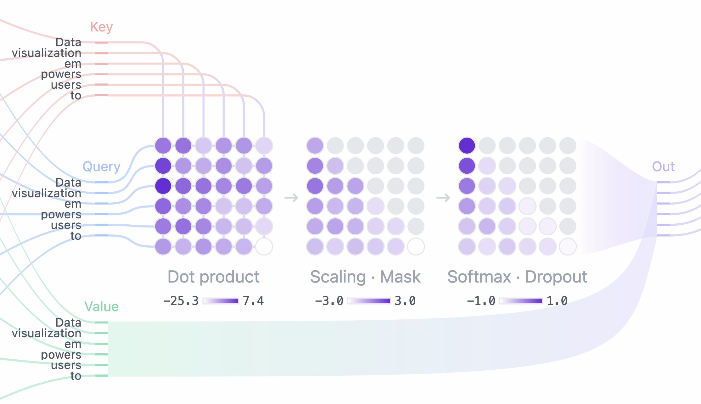 - Softmax · Dropout:在掩码和缩放之后,注意力分数通过 softmax 操作转换为概率,然后可选地使用 dropout 进行正则化。矩阵的每一行总和为 1,并指示其左侧每个其他标记的相关性。