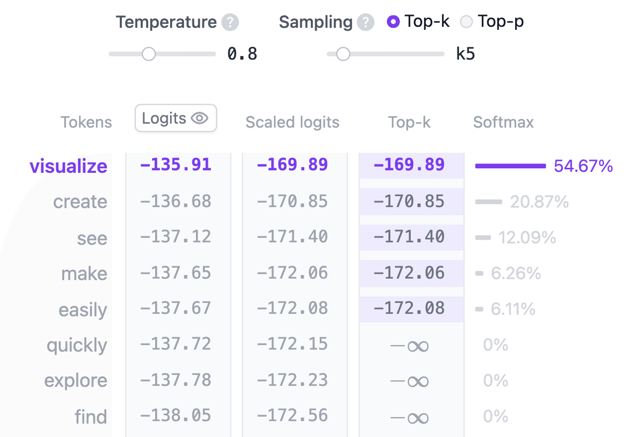 logit(对数几率)。任何标记都可能是下一个词,所以这个过程允许我们简单地根据它们成为下一个词的可能性对这些标记进行排名。然后我们应用 softmax 函数将对数几率转换为总和为 1 的概率分布。这将允许我们根据其可能性对下一个标记进行采样。